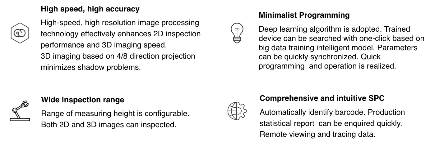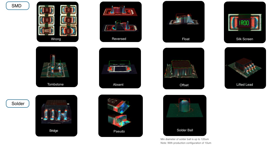 De Maker-Ray AIS431B-HW is een geavanceerd inline 3D Automatisch Optisch Inspectie (AOI) systeem, speciaal ontworpen voor SMD-inspectie met hoge nauwkeurigheid en snelheid. Dankzij de combinatie van een 21MP area array high-speed camera en RGBW- lichtprojectie levert het systeem zeer gedetailleerde 3D-beelden met een resolutie van 10–13 µm en een inspectiesnelheid tot 0,47 sec/FOV. Het systeem ondersteunt een breed scala aan PCB-formaten, van 50 × 50 mm tot 510 × 460 mm (uitbreidbaar tot 710 × 460 mm in large-board modus), met componenthoogtes tot 35 mm boven en 80 mm onder. Voor speciale toepassingen kan de optische structuur worden aangepast voor inspecties tot 40 mm hoogte.