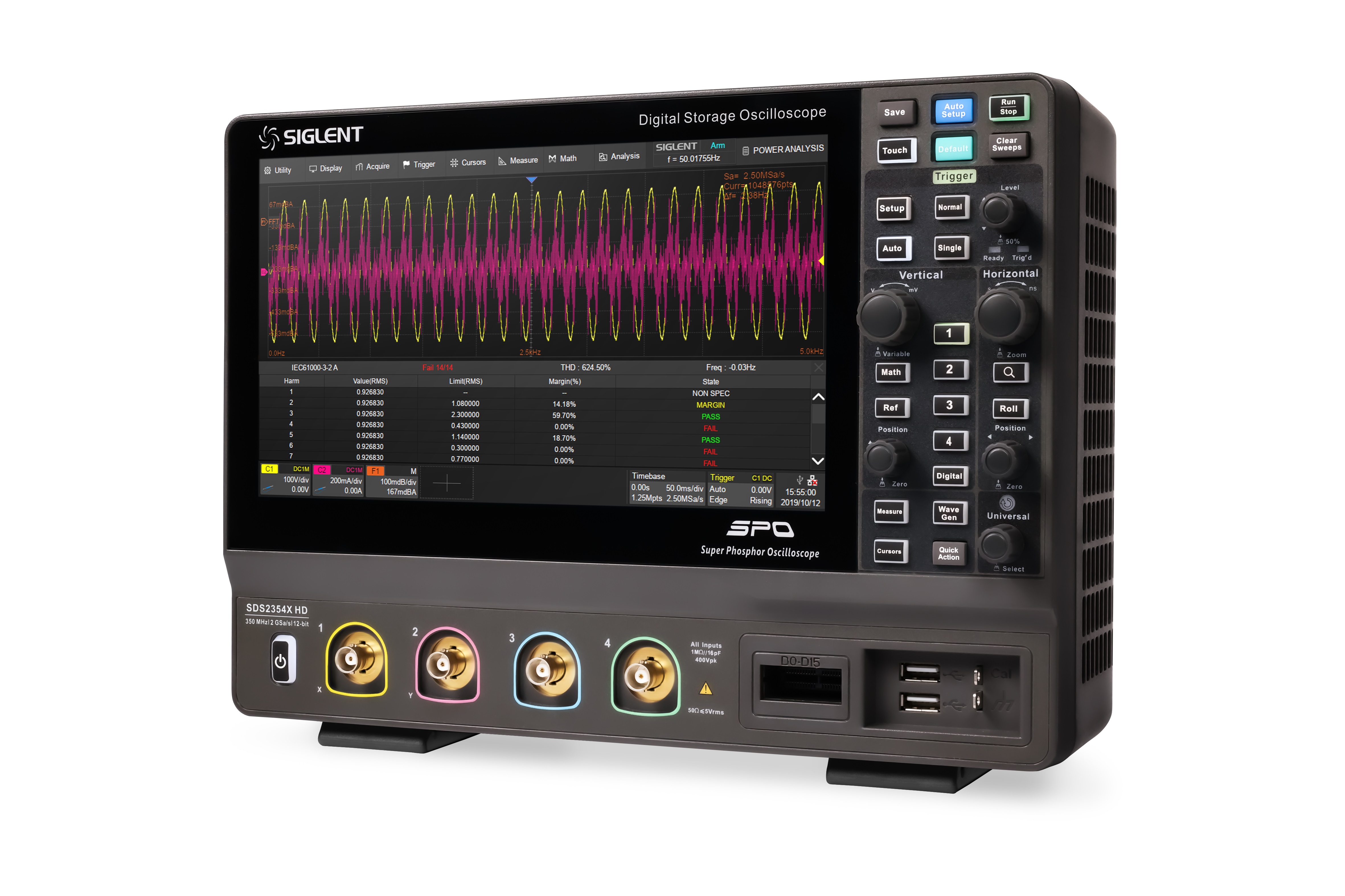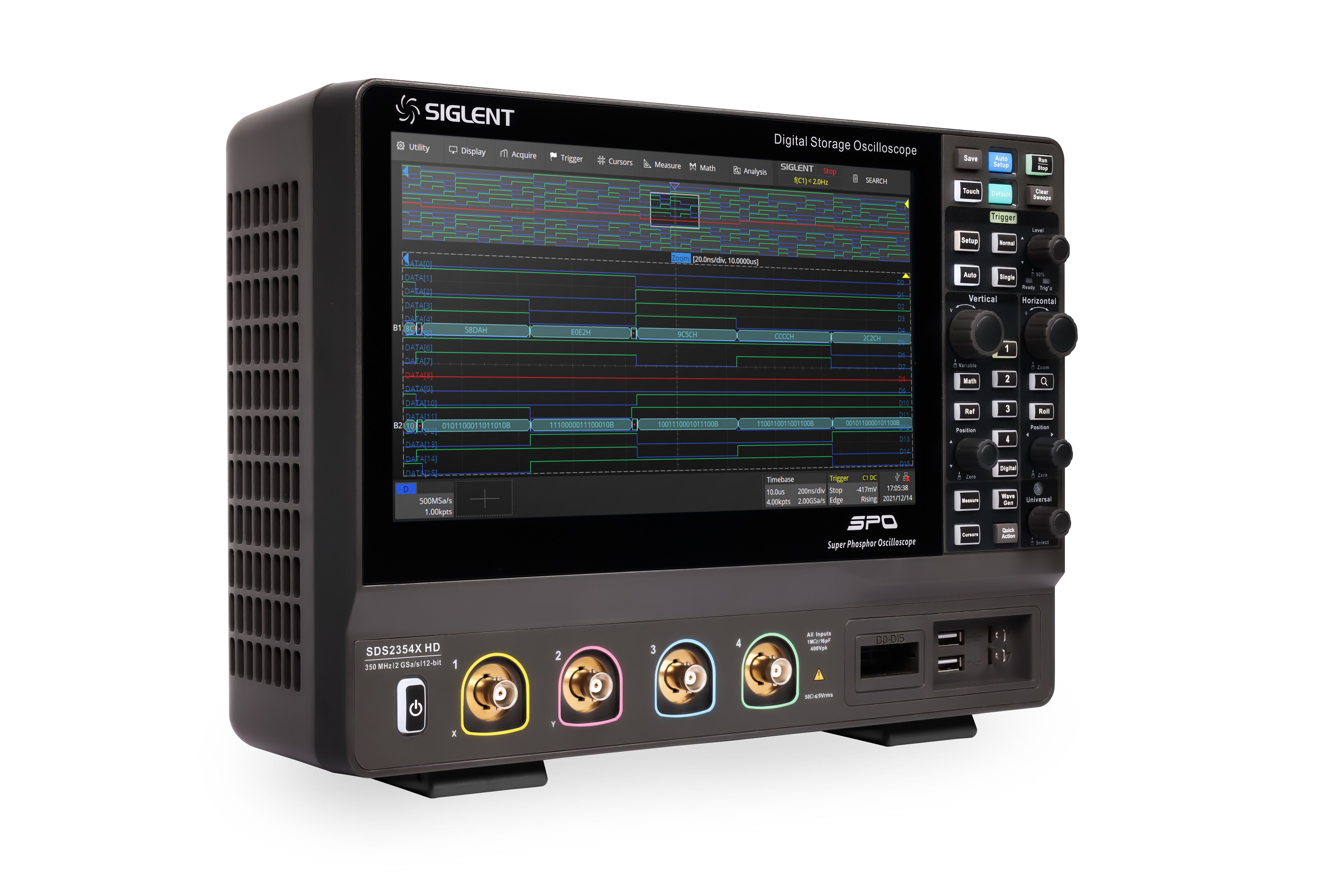 The siglent SDS2354X HD is a 350MHz bandwidth high resolution digital storage oscilloscope that is based on 2 GSa/s sample rate and 12-bit Analog-Digital Convertor front ends w excellent noise floor performance. Siglent SDS2354X HD Key Features 12-bit High Resolution. -12-bit Analog-Digital Convertors with sample rate up to 2 GSa/s. -Front ends with 70 ?Vrms noise floor @ 500 MHz bandwidth and 0.5% DC gain accuracy. 4 analog channels, up to 350 MHz bandwidth (upgradable to 500 MHz)] SPO technology. -Waveform capture rate up to 100,000 wfm/s (normal mode), and 500,000 wfm/s (sequence mode). -Supports 256-level intensity grading and color temperature display modes.